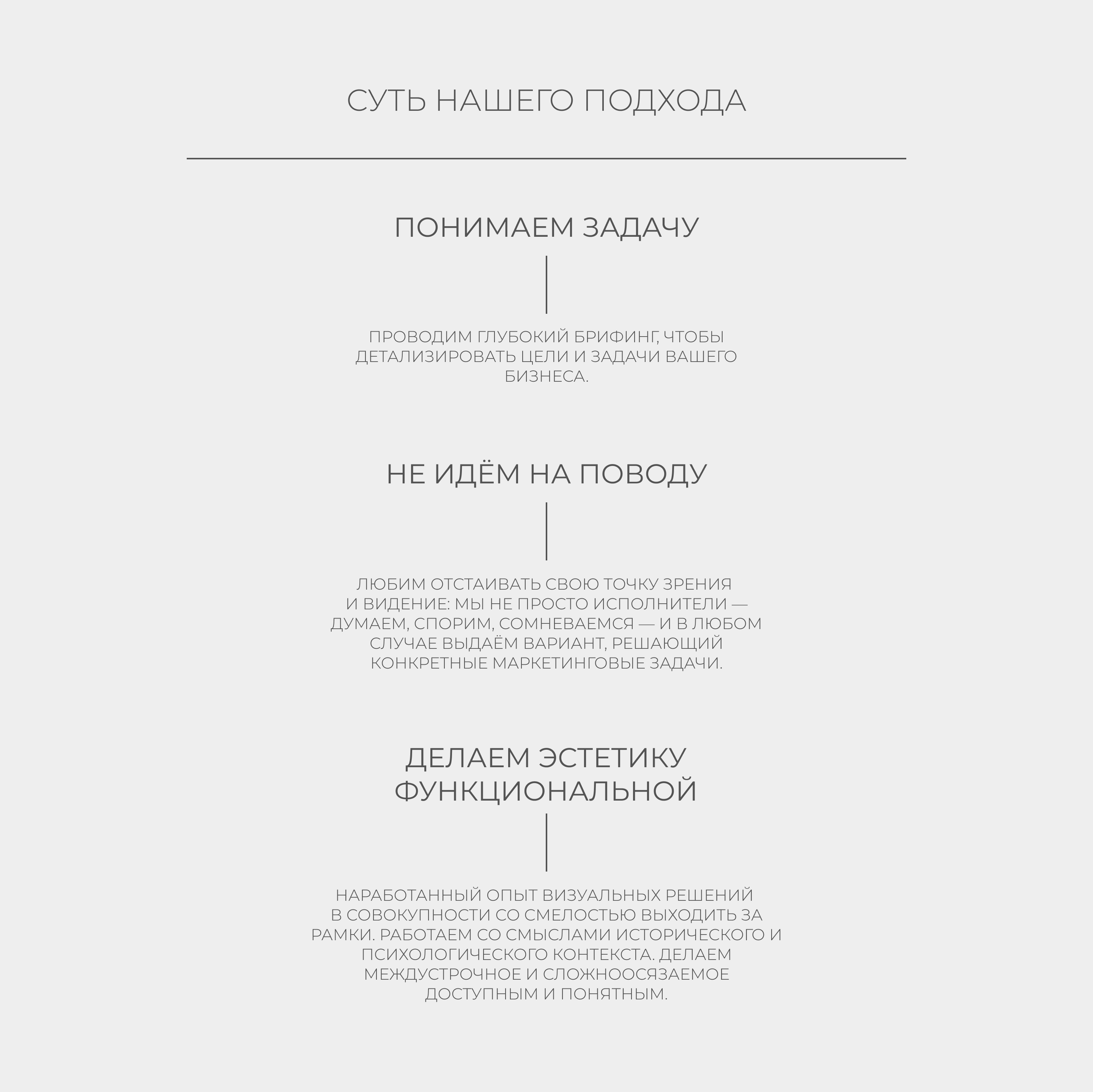 Наработанный опыт визуальных решений в совокупности со смелостью выходить за рамки. Работаем со смыслами исторического и психологического контекста. Делаем междустрочное и сложноосязаемое ДОСТУПНЫМ и понятным.